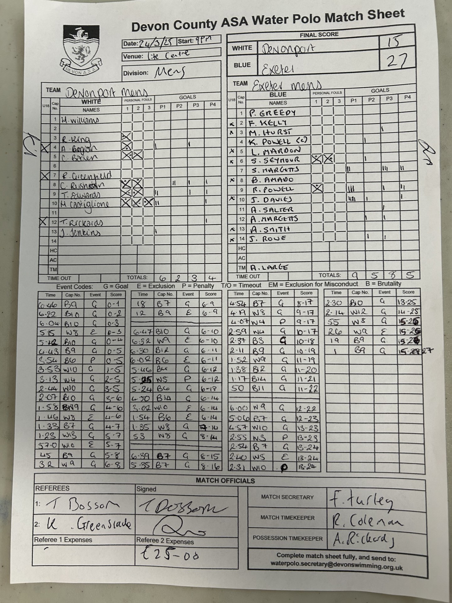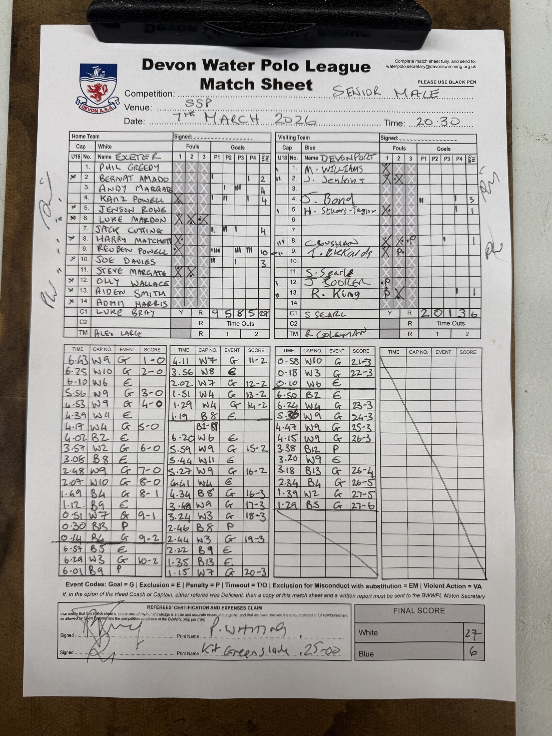 | Tue, 24 Feb | Newquay | Newton Abbot | 20-3 | Newquay Leisure World Swimming Pool | Mens/ Refs: T Bossom & A Older - Match Sheet | Fri, 6 Mar | Exeter Seniors | Devonport | 27-6 | St Sidwell Point Leisure Centre | Men | K Greenslade/P Whiting - Match Sheet | Tue, 24 Mar | Devonport | Exeter Seniors | 15-27 | Plymouth Life Centre | Mens | K Greenslade/T Bossom - Match Sheet | Sun, 3 May | Newton Abbot | Exeter Seniors | 6:15 pm | Kingsteignton Swimming Pool | Men | Referees TBC | Sun, 31 May | Newton Abbot | Newquay | 5:00 pm | Kingsteignton Swimming Pool | Mens | Referees TBC | Sun, 14 Jun | Newton Abbot | Devonport | 6:15 pm | Kingsteignton Swimming Pool | Men | Referees TBC | Tue, 16 Jun | Newquay | Exeter Seniors | 8:00 pm | Newquay Leisure World Swimming Pool | Men | Referees TBC | Tue, 15 Sep | Devonport | Newton Abbot | 9:00 pm | Plymouth Life Centre | Men | Referees TBC | Fri, 9 Oct | Exeter Seniors | Newton Abbot | 8:30 pm | St Sidwell Point Leisure Centre | Men | Referees TBC | Tue, 13 Oct | Exeter Seniors | Newquay | 8:30 pm | St Sidwell Point Leisure Centre | Men | Referees TBC |