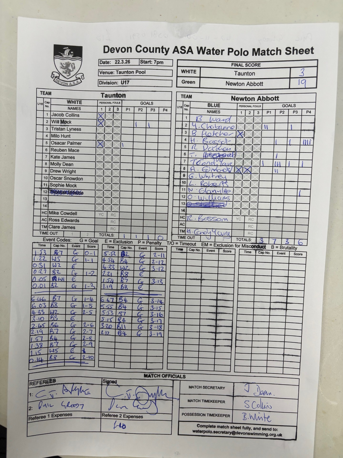 | Sat, 14 Mar | Newton Abbot U17 | Taunton Deane U17 | 2-0 | Newton Abbot Leisure Centre | CANCELLED BY TAUNTON U17 | Sun, 22 Mar | Taunton Deane U17 | Newton Abbot U17 | 3-19 | Taunton Pool | U17 | C Pryke/J Amado - Match Sheet | Sun, 12 Jul | Taunton Deane U17 | Exeter U17 | 7:00 pm | Taunton Pool | U17 | Referees TBC | Sun, 19 Jul | Newton Abbot U17 | Exeter U17 | 5:00 pm | Kingsteignton Swimming Pool | U17 | Referees TBC | Thr, 10 Sep | Exeter U17 | Newton Abbot U17 | 8:30 pm | St Sidwell Point Leisure Centre | U17 | Referees TBC | Thr, 24 Sep | Exeter U17 | Taunton Deane U17 | 8:30 pm | St Sidwell Point Leisure Centre | U17 | Referees TBC |